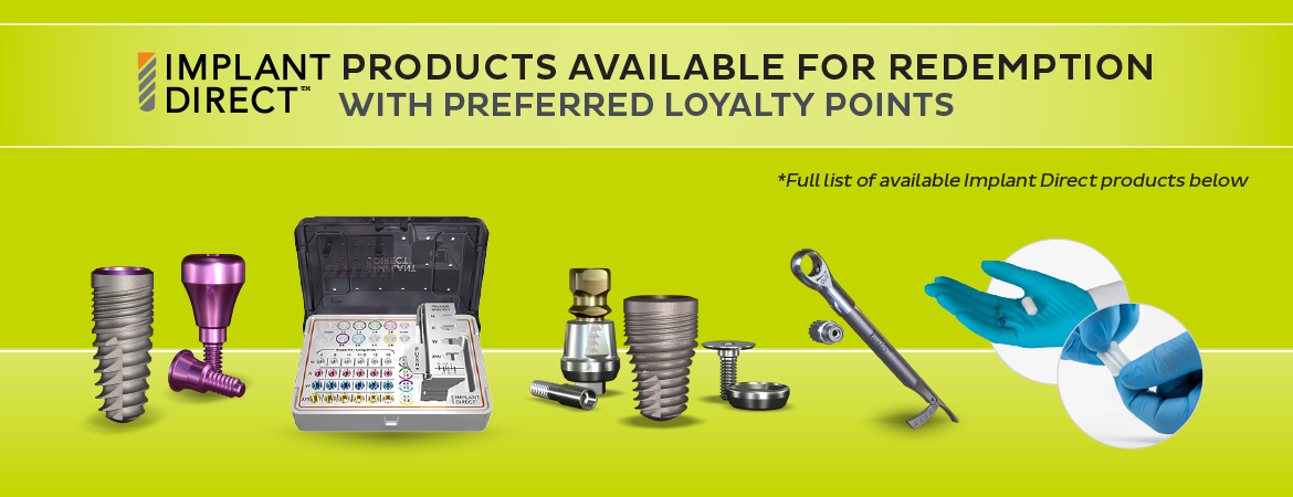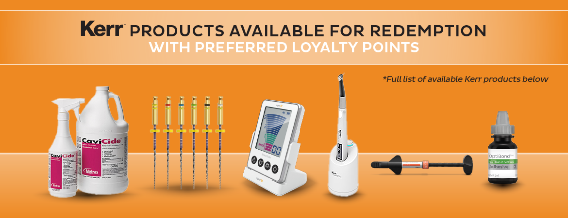 The Preferred Loyalty program is a program where you earn points simply by purchasing Kerr and Implant Direct products you know and trust. Members can redeem points earned in the program by signing into their account and visiting the Rewards page which provides them access to the catalog. Once there they can select products, Kerr Continuing Education courses or a check payable to their practice.